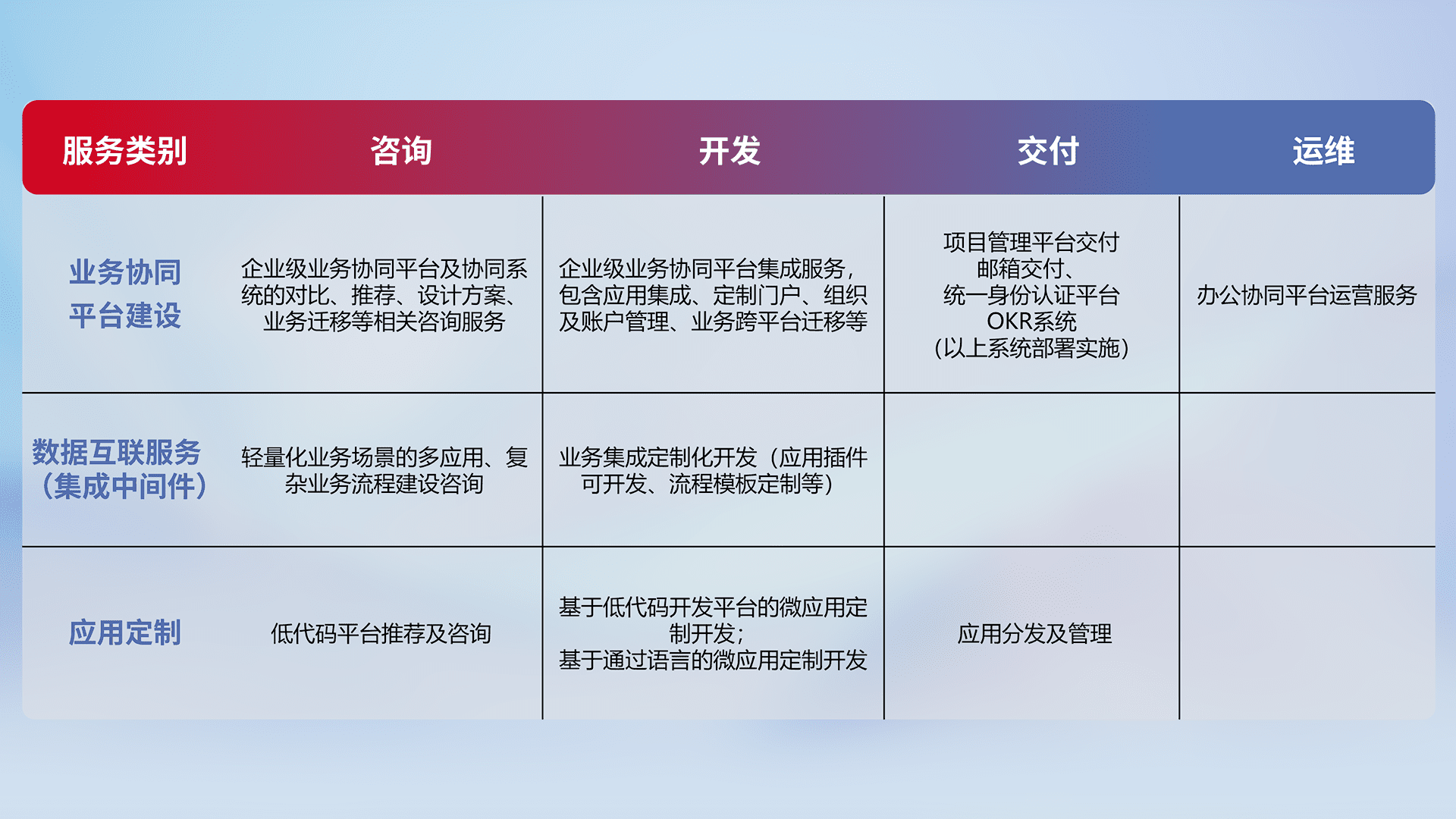 针对钉钉、、、企微、、、、IDaas等平台级产品提供产品的规划、、方案、、交付、、、定制化开发等服务,,实现如统一协同办公、、智能客户服务、、、混合会议管理、、、、智能数据查询、、等业务场景,,实现数字化转型。。